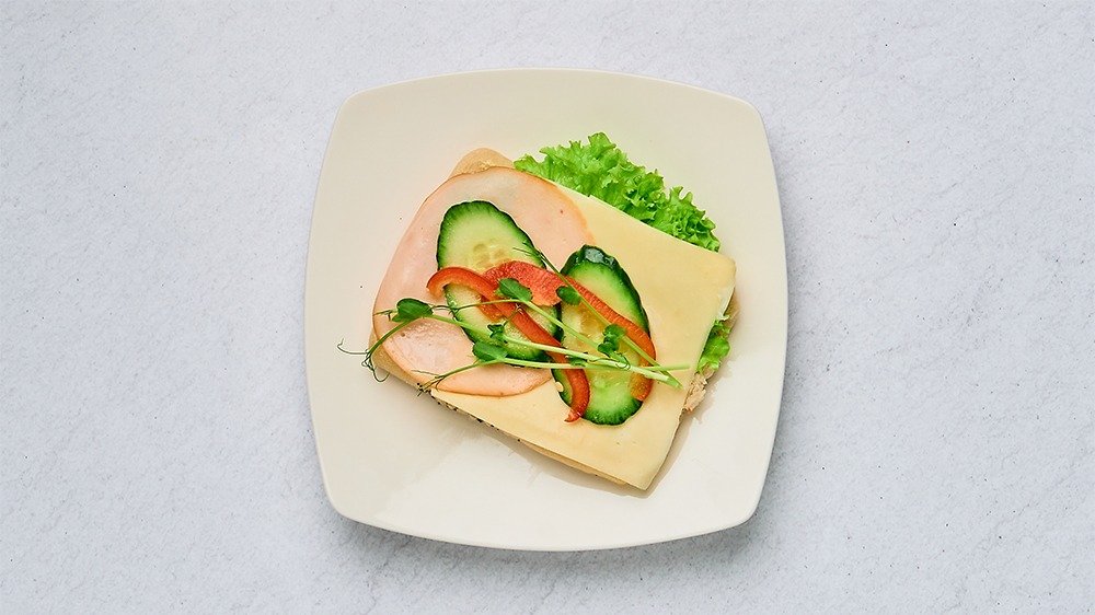 En halv nybakad surdegsfralla med ost, fylld med sallad, gurka, paprika och krispiga ärtskott – en fräsch och smakrik macka!
