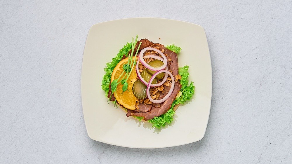 Vi erbjuder en rostbiffsmacka som utöver rosbiffen innehåller remouladsås, rostad lök, saltgurka, apelsin, gräslök och rödlök.
